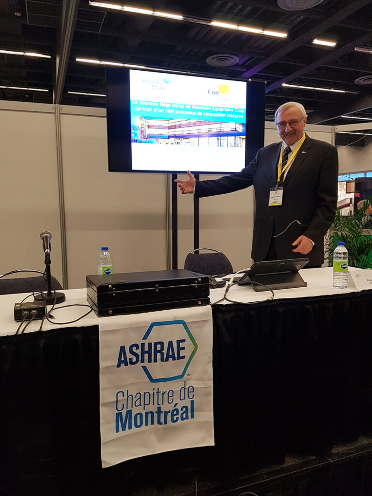 M. Roland Charneux, membre de l’ASHRAE Montréal, Directeur Pageau Morel et associés Inc., a présenté un Bâtiment certifie LEED platine de haute performance caractérisé par une structure de bois, une fenestration abondante et l’intégration de diverses technologies de pointe : « Le nouveau siège social de Mountain Equipment Co-op : le fruit d’un réel processus de conception intégrée».